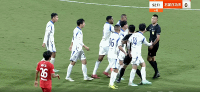 第90+8分钟,石家庄被判点球,队员情绪激动围攻裁判,随后VAR取消判罚