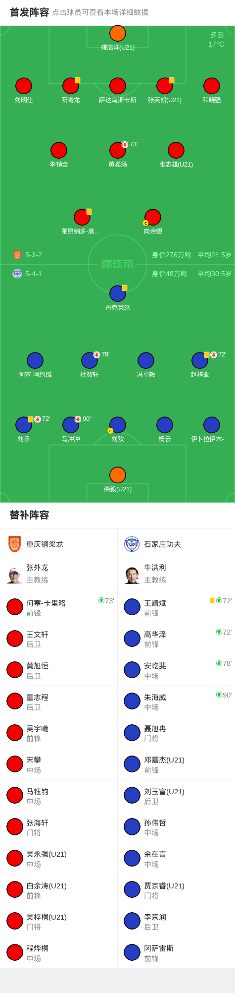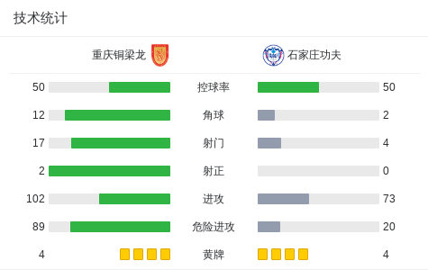 北京时间10月26日中国足球甲级联赛第28轮,重庆铜梁龙主场对阵石家庄功夫。最终比分重庆铜梁龙 0-0 石家庄功夫。